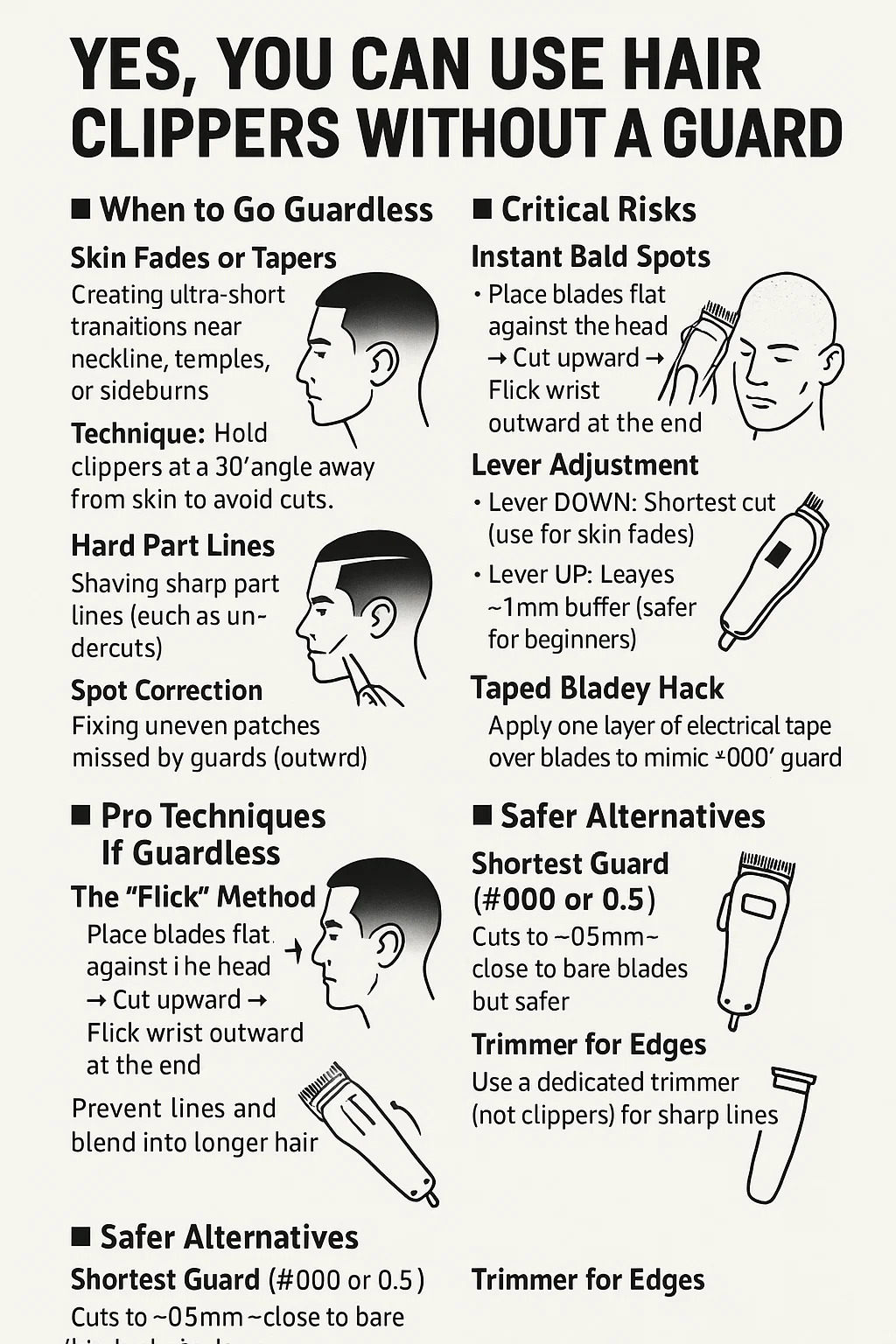 Ja, Sie können es verwenden Haarschneidemaschinen ohne Schutz, erfordert aber Vorsicht und spezielle Techniken. Folgendes müssen Sie wissen: