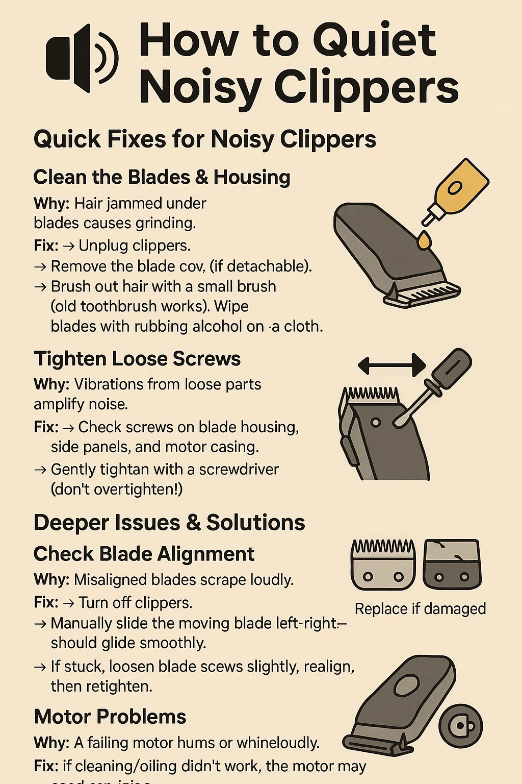 Fix: → Haarschneidemaschine ausschalten. → Schieben Sie die bewegliche Klinge manuell von links nach rechts – sie sollte reibungslos gleiten. → Wenn es festsitzt, lösen Sie die Messerschrauben leicht, richten Sie es neu aus und ziehen Sie es dann wieder fest.